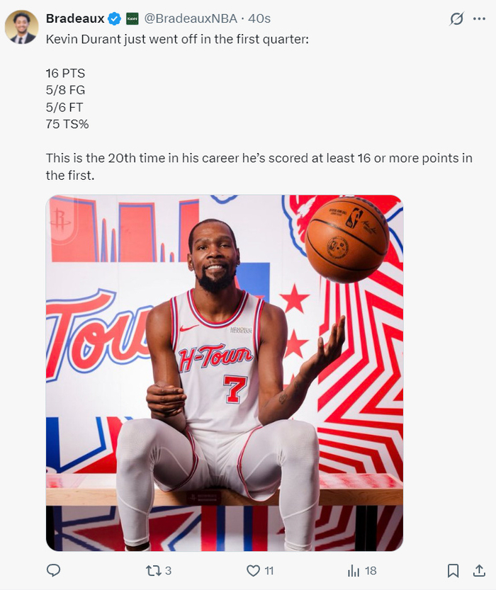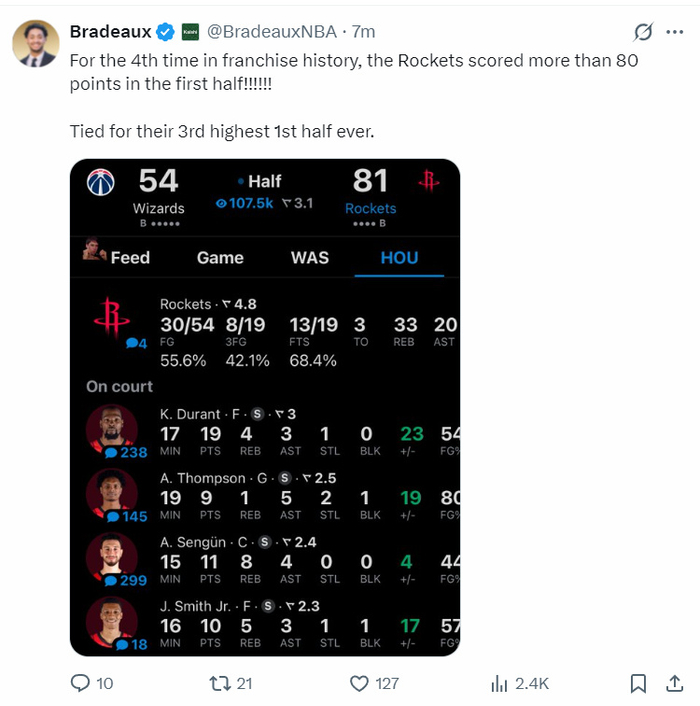 火箭记者Bradeaux写道:这是休斯顿火箭队史第四次半场拿到超过80分,也是队史半场第三高分。