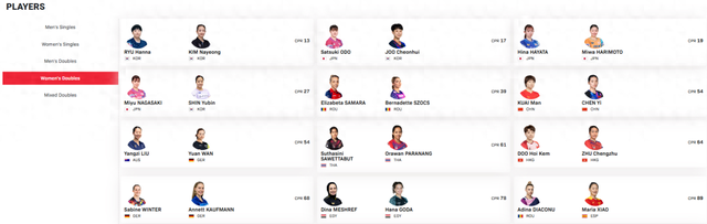 女子双打,王曼昱/蒯曼位列第一,王曼昱/孙颖莎位列第四,王艺迪/蒯曼位列第六,覃予萱/纵歌曼位列第八。