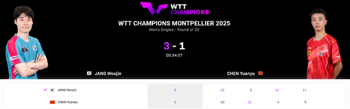 北京时间10月29日凌晨,WTT蒙彼利埃冠军赛男单1/16决赛,国乒选手陈垣宇1-3不敌韩乒选手张禹珍,四局比分:10-12、11-3、4-11、11-9。陈垣宇也首轮游了,继陈幸同、温瑞博后国乒单日三人一同首轮游。