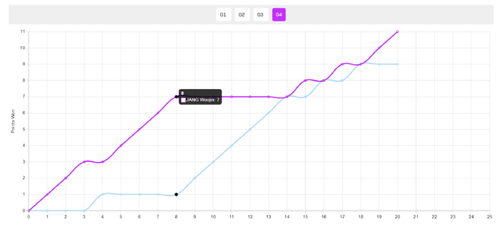 第四局陈垣宇一度是1-7落后,但他随后开始奋起直追,他打出了6-0的疯狂攻势扳平比分,随后两人8-8、9-9,这一局陈垣宇又倒在了关键2分上非常的惨烈。如果这两局是陈垣宇拿下关键分,那么陈垣宇就晋级了。