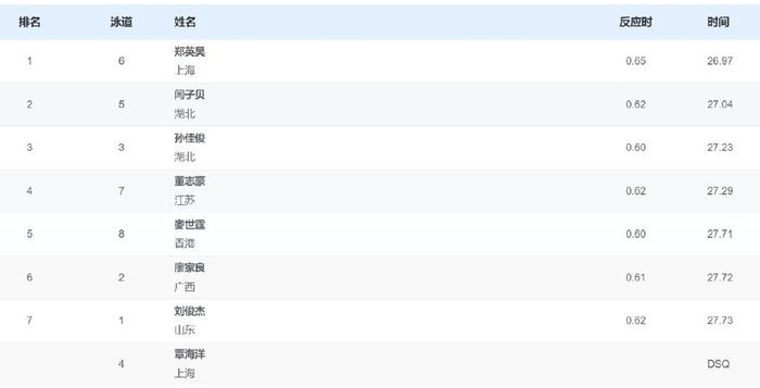 半决赛排名第1位的覃海洋决赛在第4泳道出发,比赛开始之后,几位选手的争夺非常激烈,4道的覃海洋、5道的闫子贝和6道的郑英昊几乎是齐头并进。最后的冲刺阶段,郑英昊要略胜一筹,他以26秒97的成绩率先触壁完成了比赛,闫子贝和覃海洋紧随其后到边。