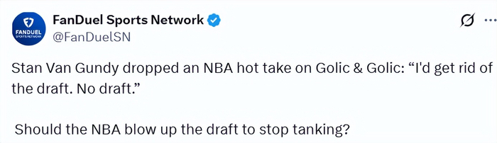 北京时间2月19日,NBA显然对球队为了选秀而摆烂的行为感到不满,而斯坦-范甘迪(大范甘迪)认为,解决问题的办法就是直接取消选秀。