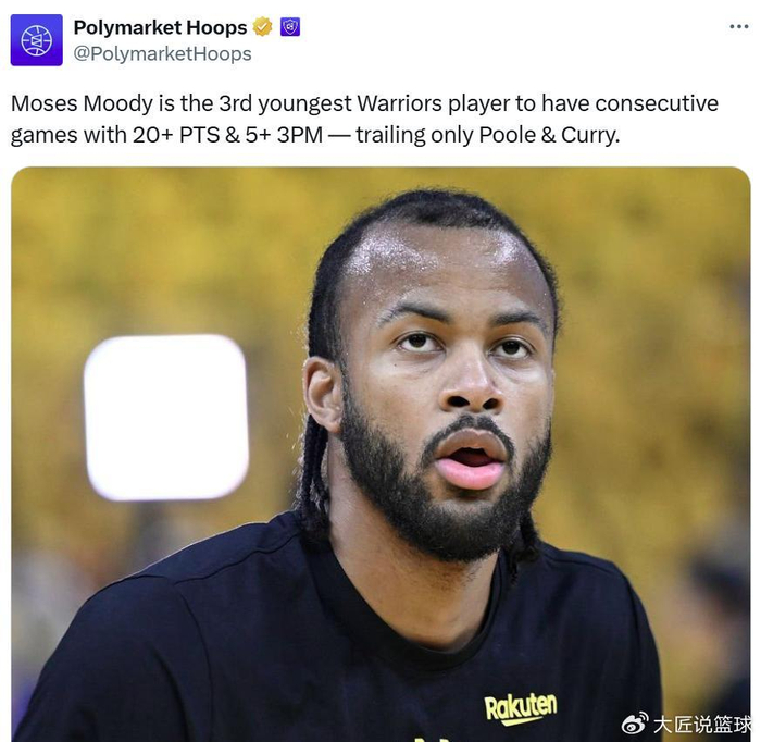凭借这样的表现,23岁159天的穆迪成为勇士队史连场砍下至少20分+5记三分第三年轻的球员,前二分别是库里和普尔,上一场对阵太阳穆迪也有24分+5记三分入账。