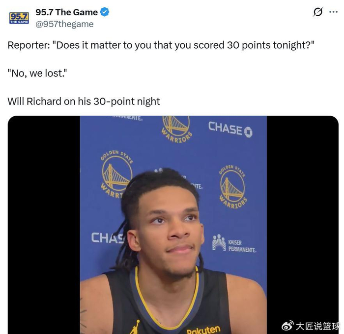 更加值得夸赞的是,在交出这样的表现后,赛后被问到单场拿下30分对自己是否重要时,理查德摇头说道:“不,我们输球了。”