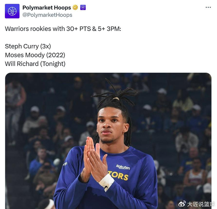 如果算上命中5记三分,理查德成为勇士队史第三位在新秀赛季交出30+5记三分表现的球员,前两人分别是穆迪与库里(3次)。
