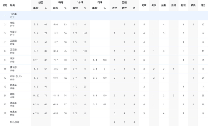 这场比赛李梦、韩旭、高颂都拿到20+,不得不说四川队的硬实力实在是太强了。李梦在全运会资格赛场均20分钟, 拿到15分5.2助攻2.2篮板0.8抢断,命中率63.4%,三分命中率25%,可以说是小试牛刀,来到正赛才开始大杀四方。